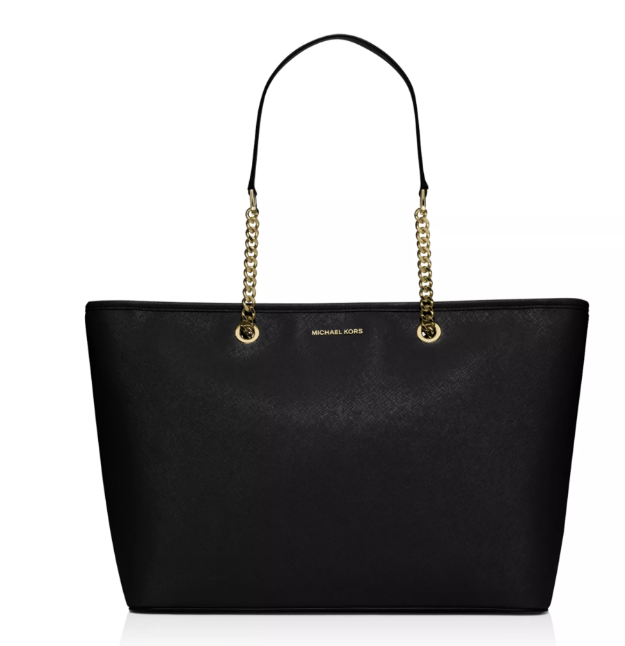 A Michael Kors Jet Set tote crafted in saffiano leather with gold-tone hardware and a fully lined interior. This Michael Kors Jet Set tote features two main pockets with a zip closure, a center zip pocket, an interior zip pocket and interior wall pockets; two chain/leather straps with a 9.5" drop. Dimensions: 17" x 10.5" x 6".